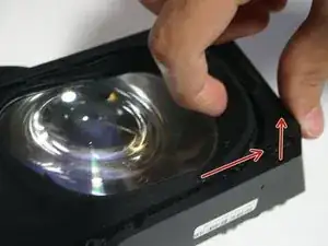 Держите внутренний край приподнятым и используйте ноготь или инструмент, чтобы потянуть наружный край тканевой пластиковый окантовки вокруг линзы наружу, освободив её от более длинных внешних пластиковых защёлок.