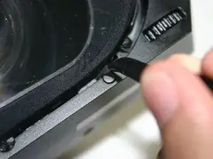 Используйте ногти или инструмент, чтобы подтянуть внутрь и наружу верхний внутренний угол тканевой облицовки вокруг линзы, отщёлкнув её с пластиковых защёлок.