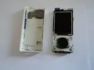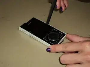 Сначала вставьте небольшой лопатка в место соприкосновения черной передней крышки и белой задней крышки.