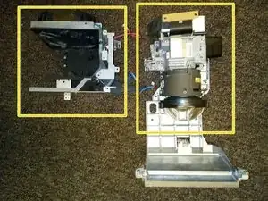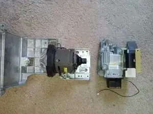 Пластиковое зеркало прикреплено заклёпками и не может быть снято без повреждений. Проектор, который я использовал для последующих этапов разборки, имеет отсутствующее зеркало.