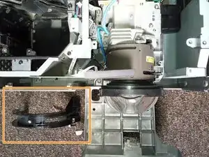 Удалите 3 серебристых винта Philips #2, 12 мм, соединяющих оптический блок DMD с передним объективом. Три винта не видны на одном изображении, поэтому приложены три фотографии.