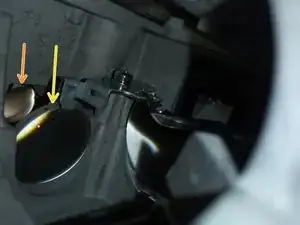 Удалите эти 2 чёрных винта Philips #2, 5 мм, которые крепят заднюю крышку зеркала.