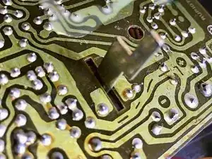 Переключатель питания батареи/сетевого питания проходит через переднюю панель на заднюю часть устройства. Обработайте слайдер в передней части средством Deoxit и участок на задней части платы в трёх местах, как показано.