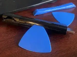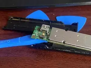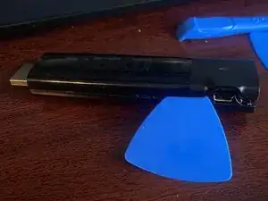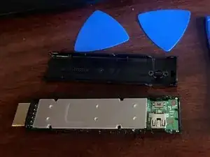 Начните с конца Roku Streaming Stick рядом с разъёмом Micro USB и кнопкой сброса: возьмите медиатор и сначала разъедините корпус в этом месте. (будьте осторожны — там используются мелкие пластиковые защёлки, которые легко сломать). Затем с помощью медиатора проскользите по каждой стороне, чтобы полностью раскрыть корпус.
