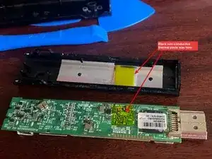 В отмеченных острых местах была чёрная непроводящая термопаста. Удалите её изопропиловым спиртом и нанесите заново непроводящую термопасту или термопрокладки на эти участки. Соберите устройство в обратном порядке.