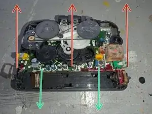 Корпус Sony WM-FX123 не скреплён одним винтом, предположительно, чтобы снизить себестоимость производства. Вместо этого он скрепляется пластиковыми зажимами, которые могут легко сломаться, если не быть осторожным, что усложнит обратную сборку. Обратитесь к фотографиям, чтобы увидеть, где расположены все зажимы. Один или два из них находятся внутри отсека для батарей.