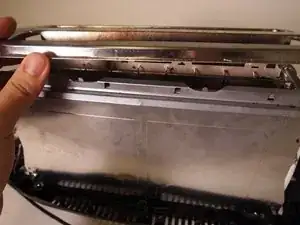 Металлическая верхняя часть всё ещё прикреплена к пружине и не может быть полностью снята с тостера.
