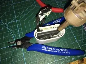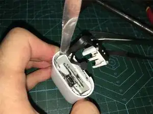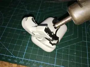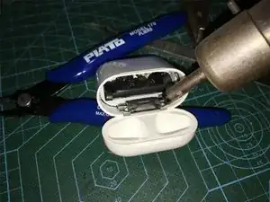 После снятия нержавеющего фиксирующего кольца нагрейте при помощи тепловой пушки индикатор и контактную базу зарядки AirPods.