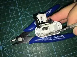 Найдите пару пинцетов и разрежьте их на две половины, чтобы сделать лопатку. Затем обработайте её на шлифовальном станке до требуемого размера — достаточно длинной и толстой для следующего шага разборки. Или купите лопатку в iFixit.