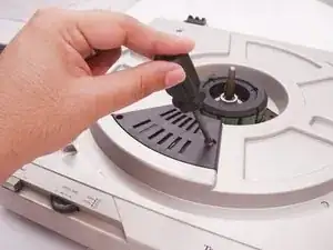 Наденьте пылезащитный кожух и переверните проигрыватель вверх дном. Открутите крепления, удерживающие каждую резиновую ножку на базовой пластине.