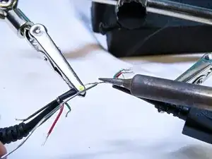 Теперь спаяйте два провода вместе. Будьте осторожны, чтобы не расплавить термоусадку, иначе она может попасть на медные провода.