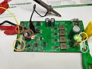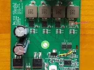 В следующих пунктах описан ремонт четырёхфазного повышающего преобразователя. Он формирует 25 В или 45 В из 12 В в режиме работы от аккумулятора в зависимости от громкости. Каждая из четырёх фаз состоит из MOSFET-транзистора, диода, двух резисторов измерения тока и катушки.