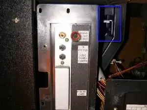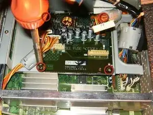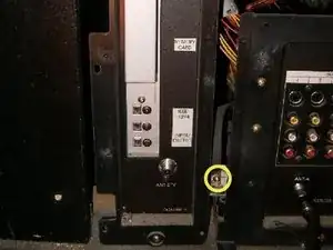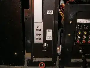 Снизу справа находится винт, соединяющий заземляющий шнур и удерживающий плату в шасси, ослабьте его.