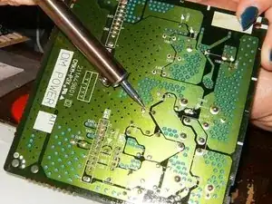 Удалите напайку всех конденсаторов и извлеките их. В этом ремонте использовались паяльник на 30 ватт и отсос для припоя. Отсос можно заменить оплеткой для припоя.