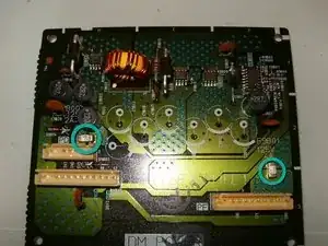 После того как все разъемы отключены, а заземляющий шнур снят, аккуратно выньте плату DM из шасси. У некоторых моделей есть небольшой язычок, который необходимо нажать, чтобы освободить плату.