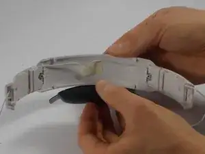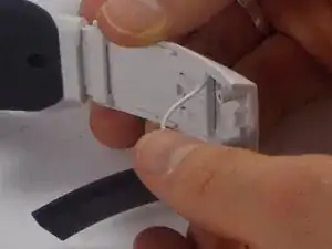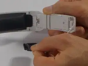 Сильно отожмите черный резиновый кронштейн от белой направляющей. Этот шаг вызывает смещение маленького металлического кронштейна внутри направляющей; после этого черный резиновый кронштейн можно вернуть на место, но металлический кронштейн нельзя поставить обратно.