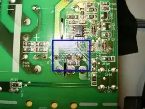 Тщательно осмотрите платы. Коричневое обесцвечивание вокруг диода D102 свидетельствует о коротком замыкании, возможно, о вышедшем из строя компоненте.
