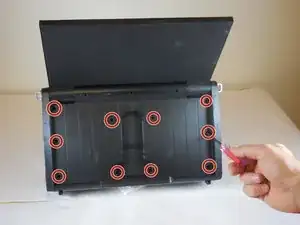 Отвинтите десять винтов на задней стороне устройства с помощью отвёртки PH0 с длинной шейкой.