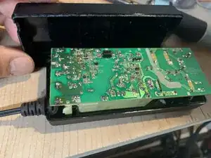 Установите печатную плату обратно в корпус. Сторона платы с компонентами должна быть обращена к жёлтому уплотнителю. Усилитель натяжения провода вставляется в маленькое отверстие на одном конце корпуса. Гнездо сетевого шнура устанавливается на конце с большим прямоугольным отверстием.