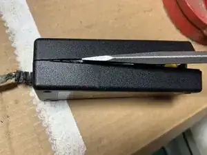 Вытяните оставшийся шнур из втулки для снятия напряжения. Похоже, что он там приклеен, поэтому, вероятно, вы получите длинную оголенную часть проводов. Внутри втулки останется много черной изоляции провода.