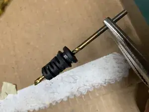 С помощью сверла малого диаметра расширьте отверстие через середину втулки для снятия напряжения, чтобы оно стало достаточно большим, чтобы пропустить шнур обратно (рисунок 2). Должно выйти много черной изоляции. Может помочь переход от маленького сверла к более крупному по размерам.