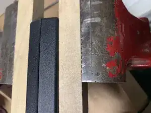 Чаще всего корпус блока питания склеен, как в случае с изображенным блоком Bose. Чтобы аккуратно разъединить склеенный шов: используя деревянные бруски, чтобы не поцарапать пластик, зажмите блок в тисках и затяните до тех пор, пока не услышите легкие щелчки — клей начнет давать. Обратите внимание, как шов корпуса вздувается вверх (первая фотография).