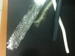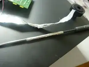Далее используйте инструмент (например, тонкий стержень), чтобы свернуть алюминиевую фольгу в трубку. Затем проденьте провода звукоснимателя в эту алюминиевую трубку.