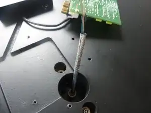 Теперь закрепите плату на деревянной монтажной плите. Используйте оригинальную чёрную пластиковую шайбу и следите, чтобы сама плата не касалась алюминиевой фольги.