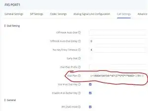 Теперь перейдите в Port Settings > FXS Port 1 > Call Settings. В поле Dial Plan введите следующее: { <18004104104=*47127*0*0*1*6060> | 911 | 411 | 611 | 988 | 1xxxxxxxxxx | [2-9]xxxxxxxxx | 011x+ | x+ | \+x+ | *x+ | *xx*x+ } (Предполагается, что вы используете 1-800-410-4104 как номер менеджера; вы можете его изменить)
