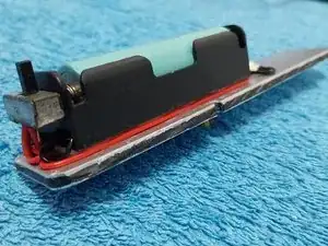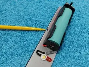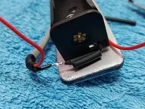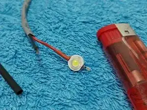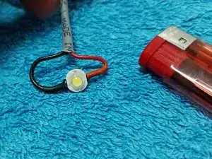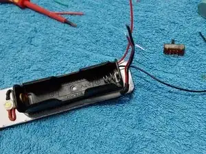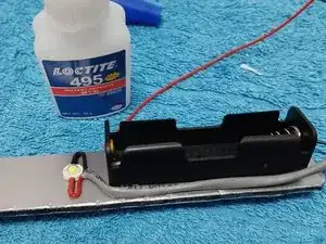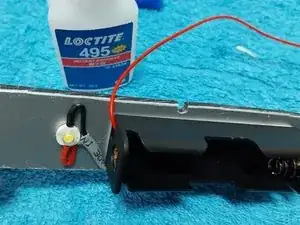 После прикрепления светодиода и держателя батареек выполняется прокладка проводки, фиксируя её цианокрилатным клеем по обе стороны держателя батареек.
