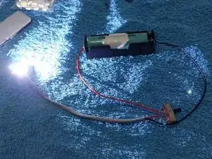 Первый тест подсветки: временное подключение держателя батареек и светодиода, чтобы определить, на какой высоте должен располагаться светодиод; приклеен к металлической пластине, которая для этих высокомощных светодиодов служит радиатором.