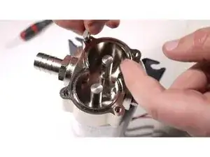 Это может быть сложно на меньших насосах: если у вас недостаточно места, чтобы сдвинуть её пальцем, как на картинках, используйте магнитную плоскую отвёртку для металлической шпонки или плоскую отвёртку с небольшим количеством смазки, чтобы зафиксировать пластиковую шпонку.