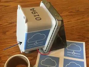 Наклейте стикер open‑storm на боковую сторону корпуса, как показано