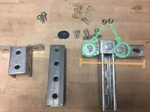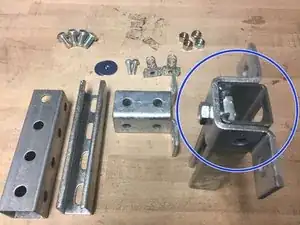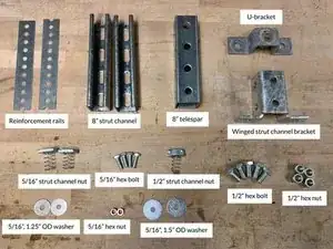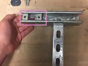Прикрутите U‑кронштейн к одному из 8‑дюймовых профилей, используя один 1/2‑дюймовый шестигранный болт и 1/2‑дюймовую гайку для профиля