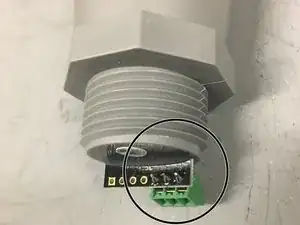 Припаяйте трехштырьковый клеммник к отверстиям для земли, питания и данных (#5) на плате датчика глубины