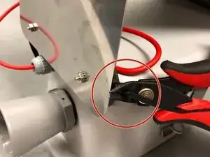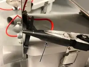 Возьмите хомут и зафиксируйте красную часть провода к черной секции, используя дрель с соответствующим сверлом