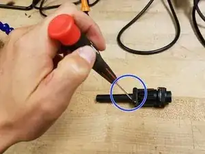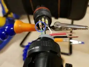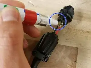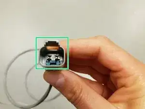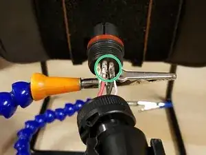 20. Проденьте металлические наконечники с проводами сзади в 2-контактный разъём Amphenol. Защёлкивание будет слышно.