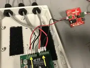 55. Подключите толстые красный и чёрный провода от 6-контактного амфенолового кабеля автоматического пробоотборника к релейной плате.