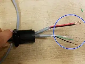4. Отмерьте и отрежьте по два фута многожильного медного провода сечением 4-22 AWG (изолированные провода красного, белого, чёрного и зелёного цветов) и по два фута многожильного медного провода сечением 2-16 AWG (красного и чёрного). Проденьте оба провода через корпус 6-контактного разъёма Amphenol.