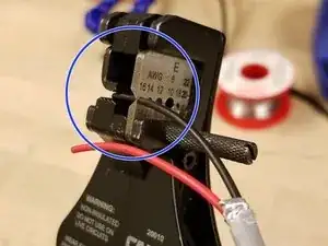 16. Отмерьте и отрежьте по два фута многожильного медного провода сечением 2-16 AWG (красного, чёрного). Снимите по 2 дюйма серой изоляции с обоих концов.