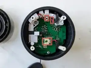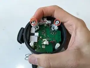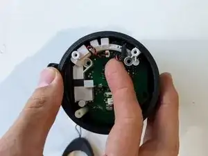 Печатная плата очень плотно зафиксирована внутри корпуса. Самый простой способ снять ее — сжать между белыми пластиковыми цилиндрами, прикрепленными к печатной плате, и противоположной стороной корпуса (как показано на первом изображении). Это позволит вам начать наклонять плату.