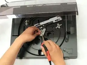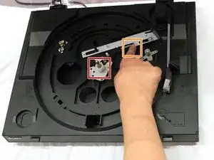 Под металлическим диском находятся 2 пластиковые шестерни. Эти шестерни используются для перемещения тонарма, когда проигрыватель включён. Если тонарм не перемещается правильно во время работы, причиной могут быть эти шестерни. В этом руководстве показано, как их заменить