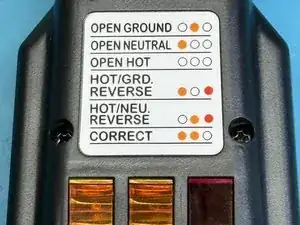 Вставьте прибор в розетку и считайте индикаторы по схеме. (Обратите внимание, что на моём изображении фактический тест показывает нормальные индикаторы справа, а не слева, как указано на схеме. Это связано с ориентацией розетки.)