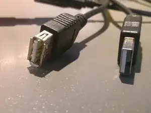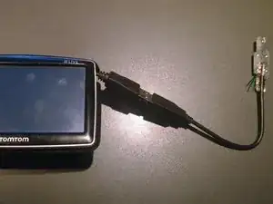 Можно использовать любой кабель с двумя жилами. Я использовал удлинитель USB, чтобы можно было легко подключать и отключать GPS-элемент от TomTom. Я разрезал кабель пополам и припаял две жилы (я использовал белую и красную) к двум контактам GPS-элемента посередине на задней стороне.