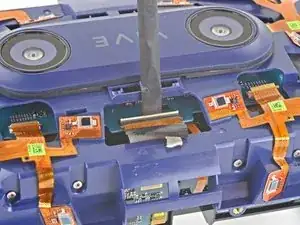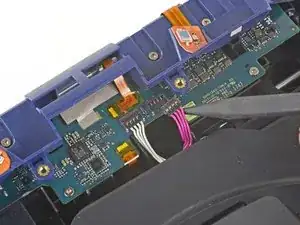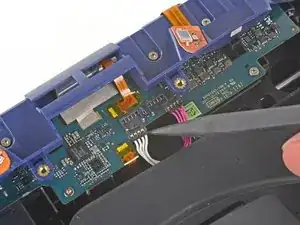 Используйте острый конец лопатки, чтобы приподнять и отключить фиолетовые и белые провода от дочерней платы.