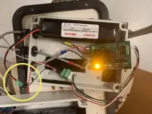 Затем, взявшись за зелёный разъём, вытащите батарейный разъём из контроллера заряда солнечной панели.