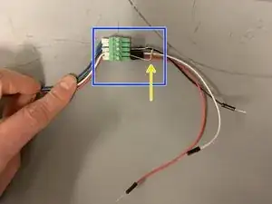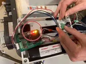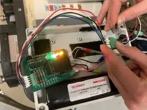 Подключите красный и чёрный перемычечные провода к правильным клеммам 3.7В батареи узла. Жёлтый светодиод должен загореться немедленно.