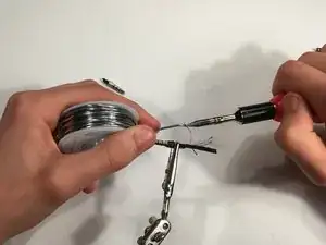 Используйте инструмент «третья рука», чтобы удерживать провода при нанесении припоя и работе паяльником.