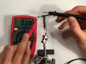 Выберите провод и прикоснитесь одним щупом мультиметра к залатанному кончику.