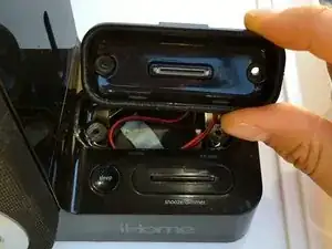 Удалите два винта Phillips #0 длиной 8 мм из адаптера iPod iHome.